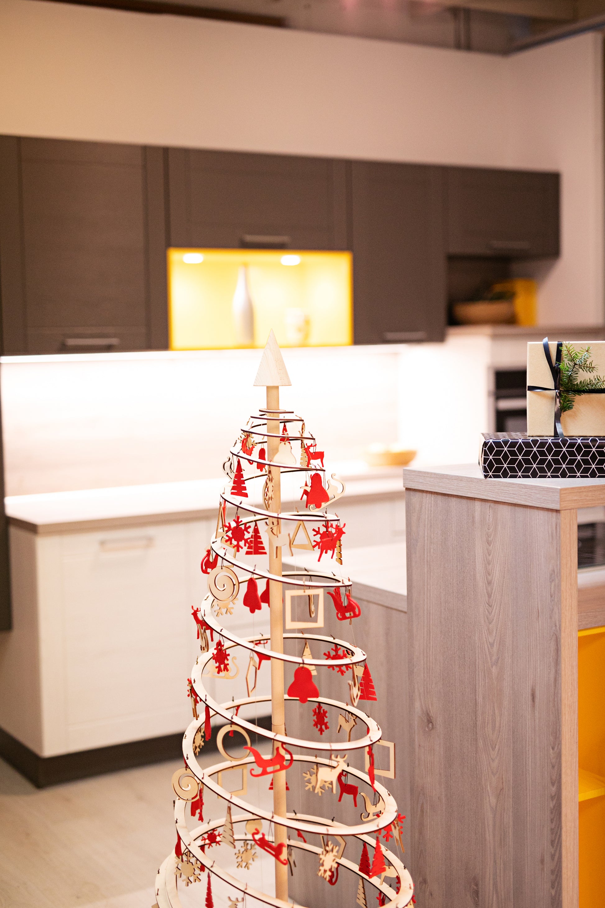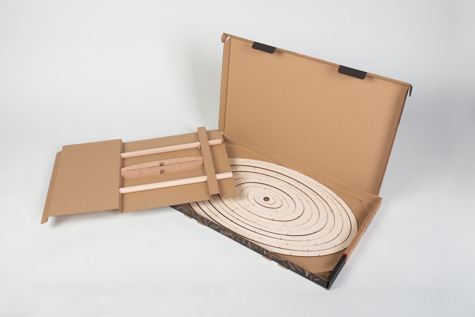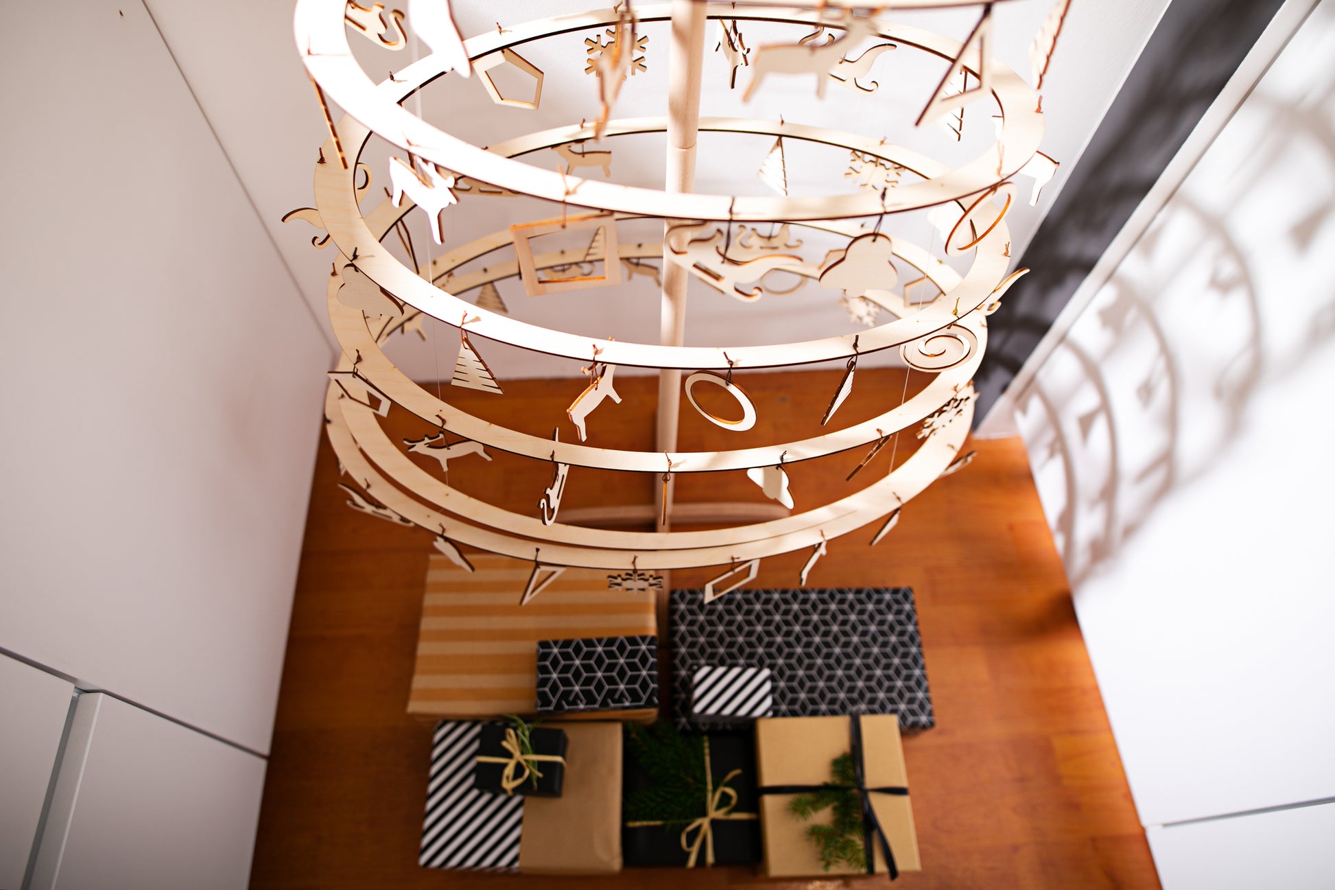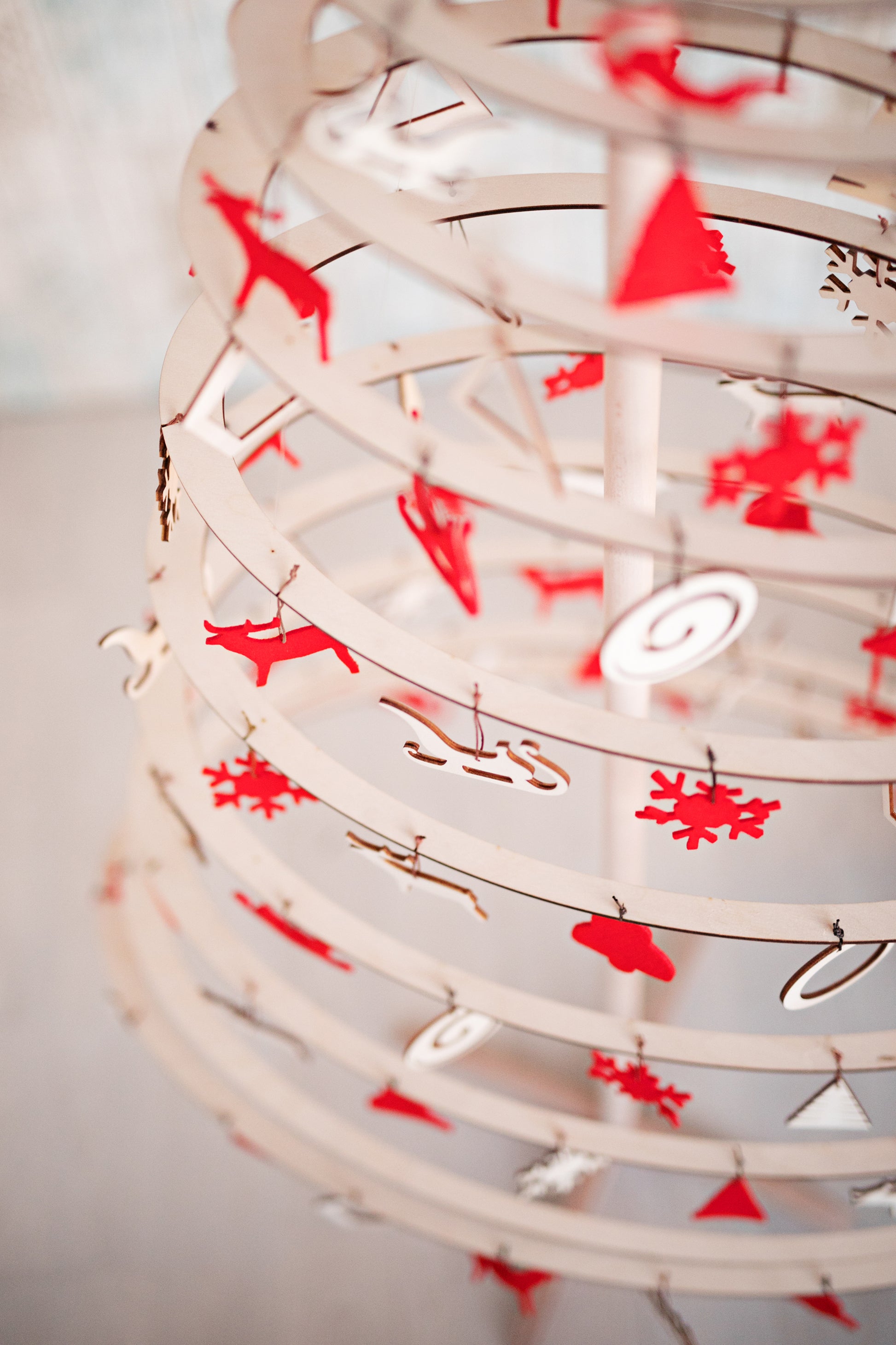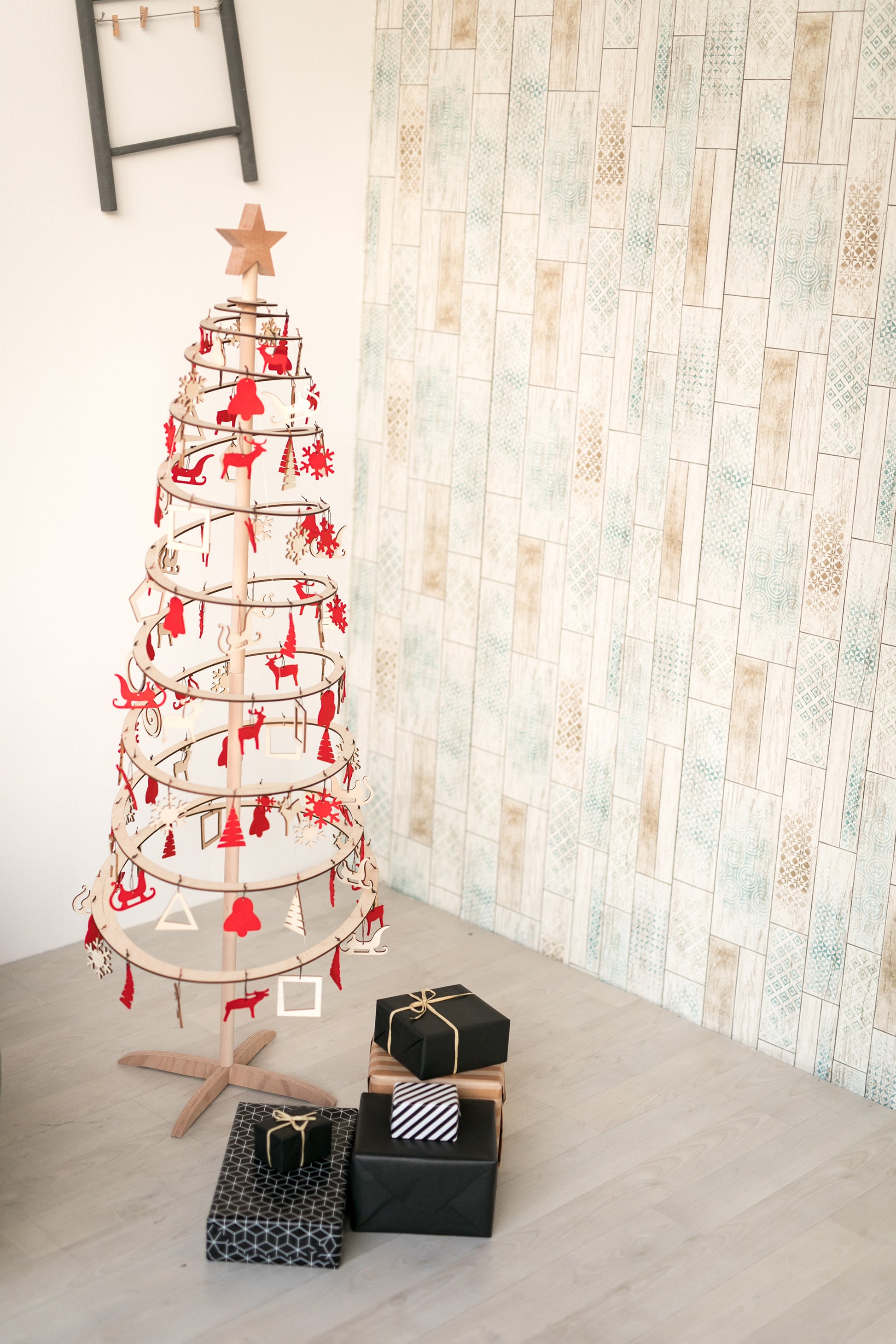 El árbol de Navidad que tienes delante está hecho de contrachapado cortado a láser y tiene un soporte de madera. Se monta y desmonta rápidamente. Además, se guarda fácilmente en una caja de 5 cm de alto.
