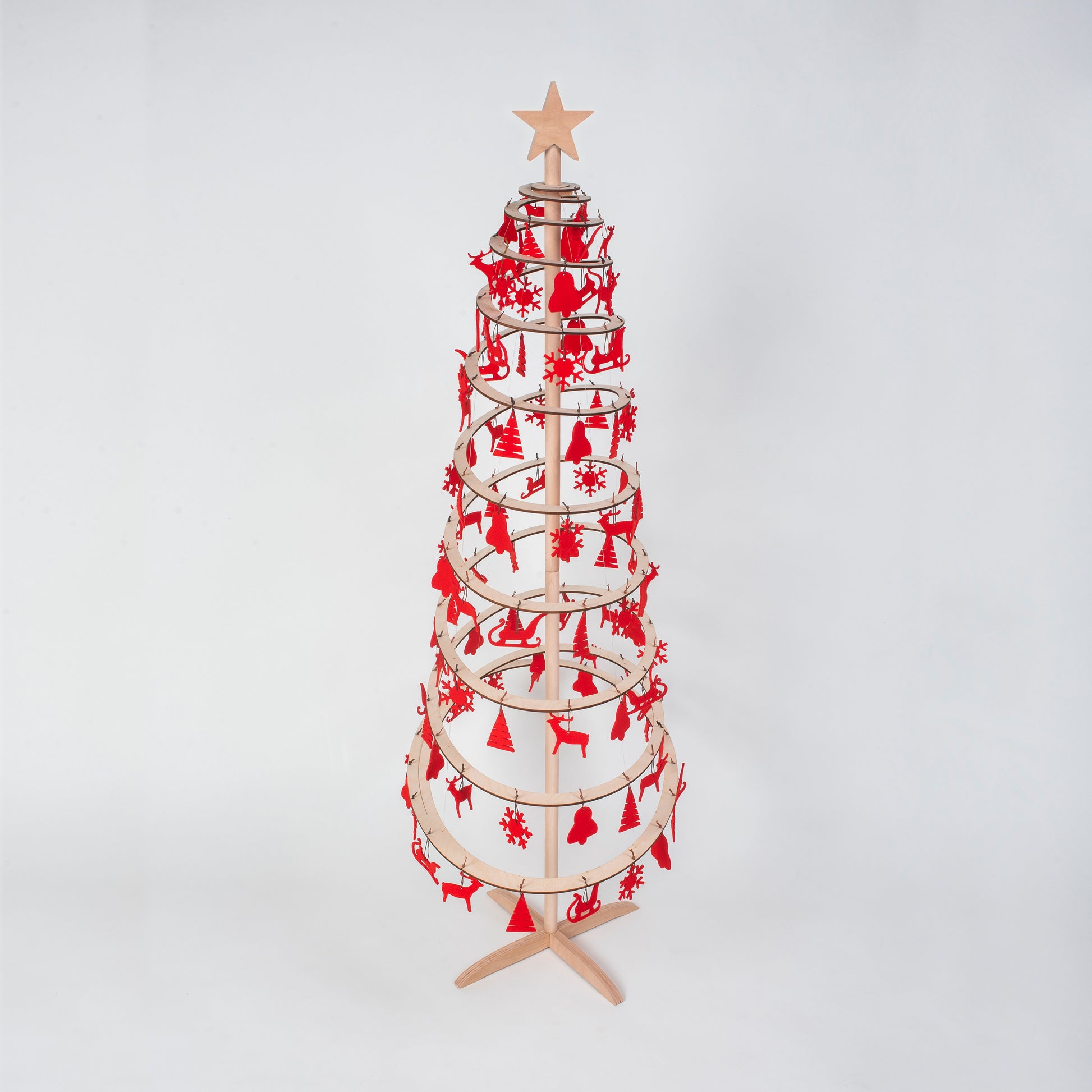 Una combinación de adornos de fieltro en 5 formas populares con temas navideños para su árbol Spira. Cada juego contiene una cierta cantidad de adornos de fieltro y una copa de estrella de madera. Se incluyen cordones para colgar.