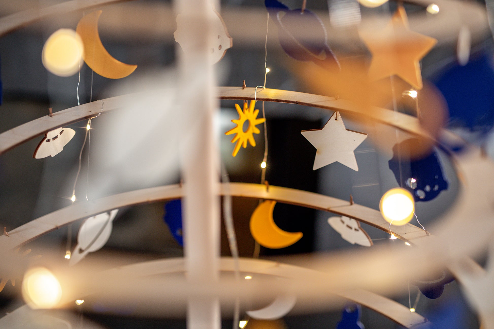 El juego incluye una estrella de madera para copa de árbol y una cantidad adecuada de adornos hechos de fieltro y madera azul y amarillo. Se incluyen cordones para colgar.