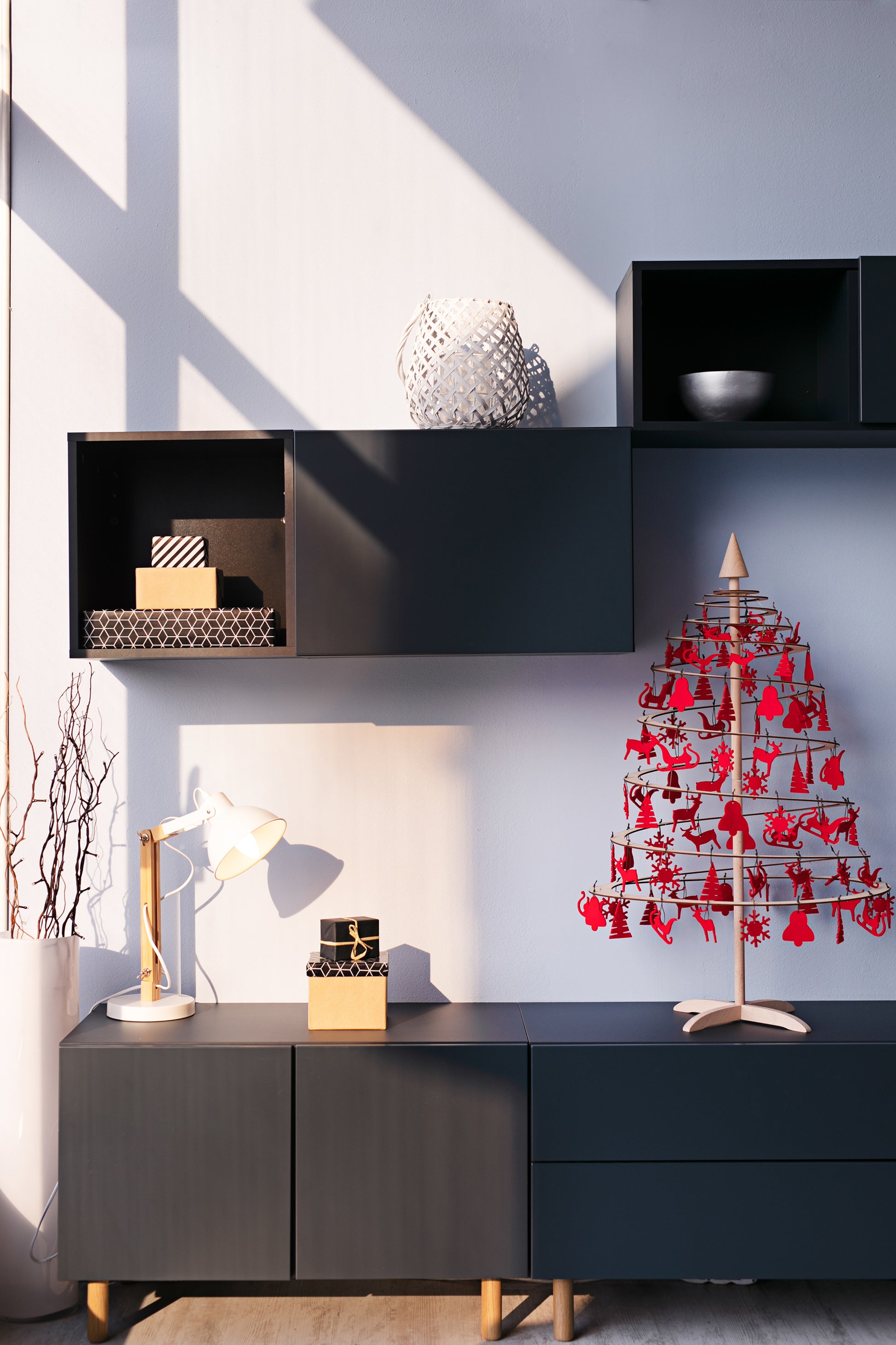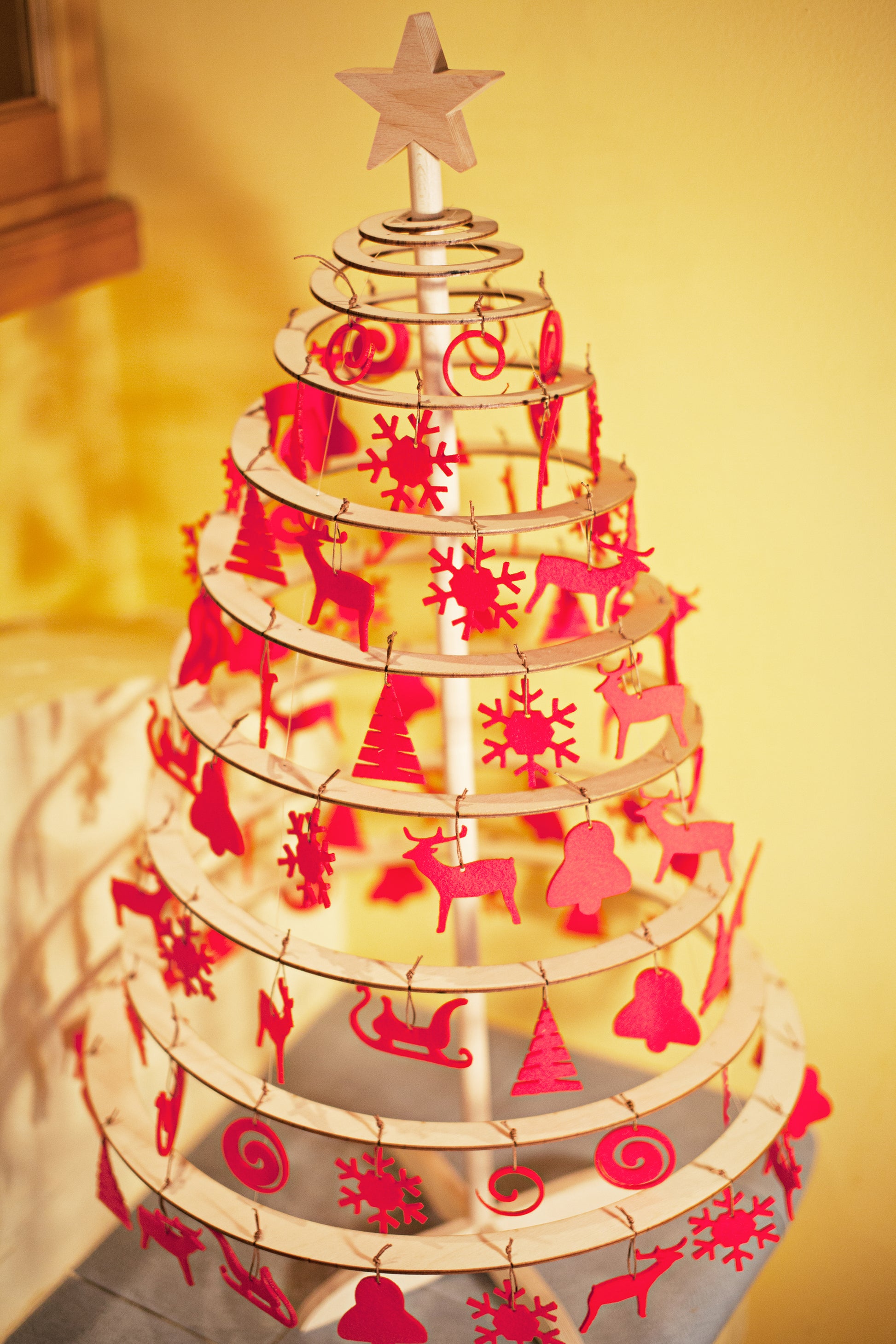 Un conjunto de adornos de fieltro rojo y una copa de estrella de madera para árboles de Navidad Spira de todos los tamaños. Lindas decoraciones crearán el ambiente festivo perfecto en casa. Lo único que falta es la cena de Navidad y las personas que más significan para ti.
