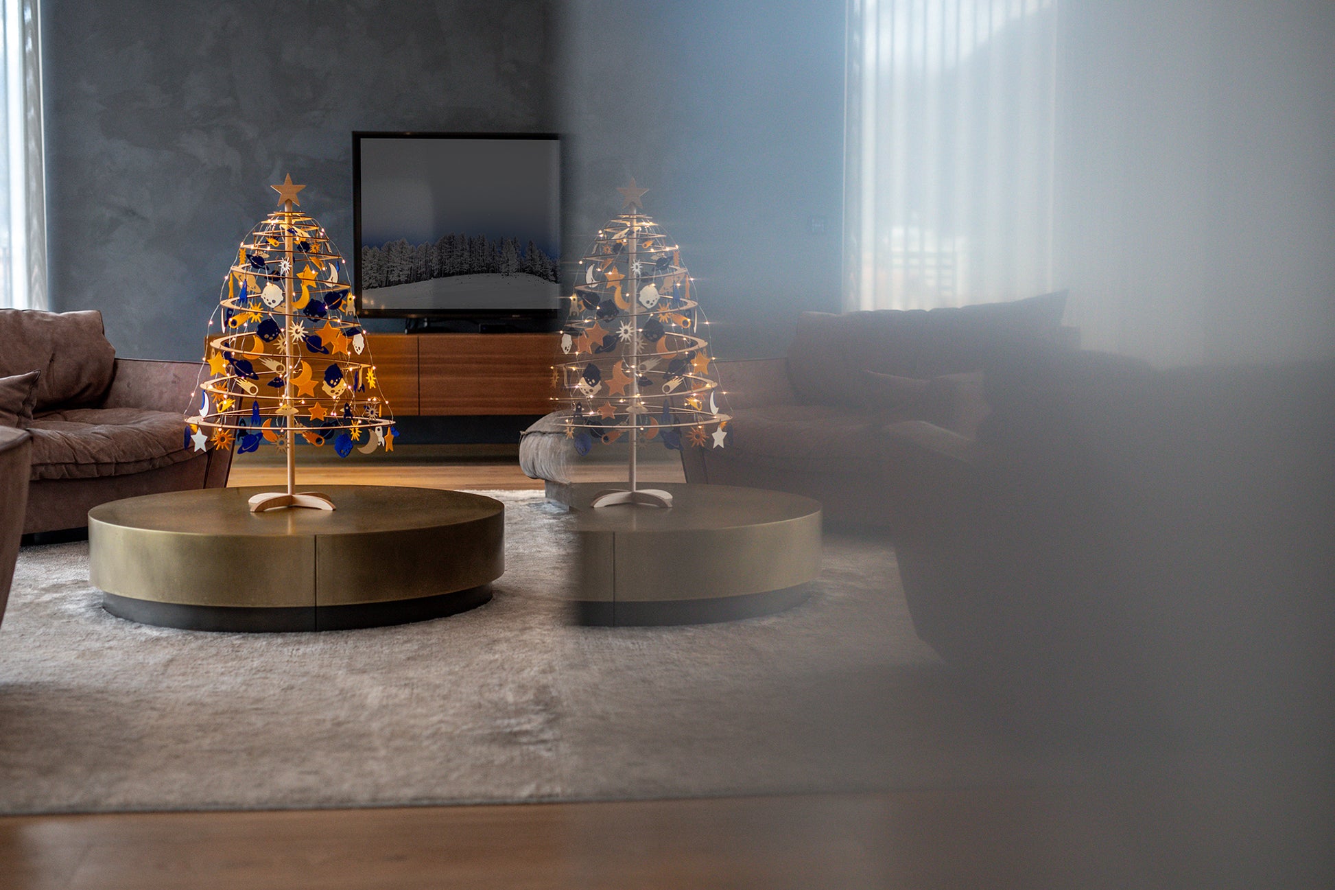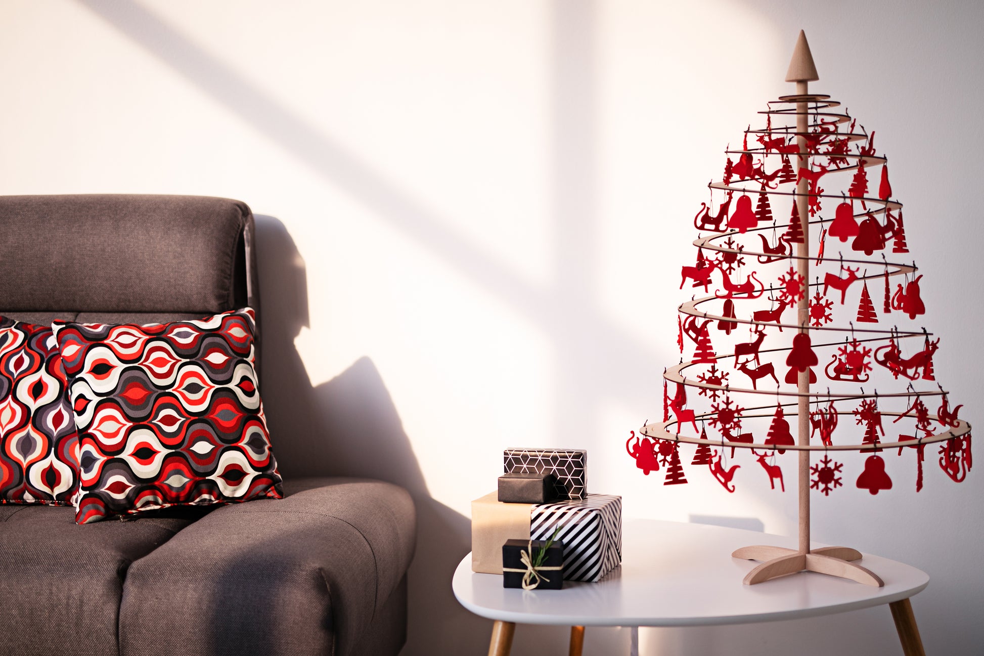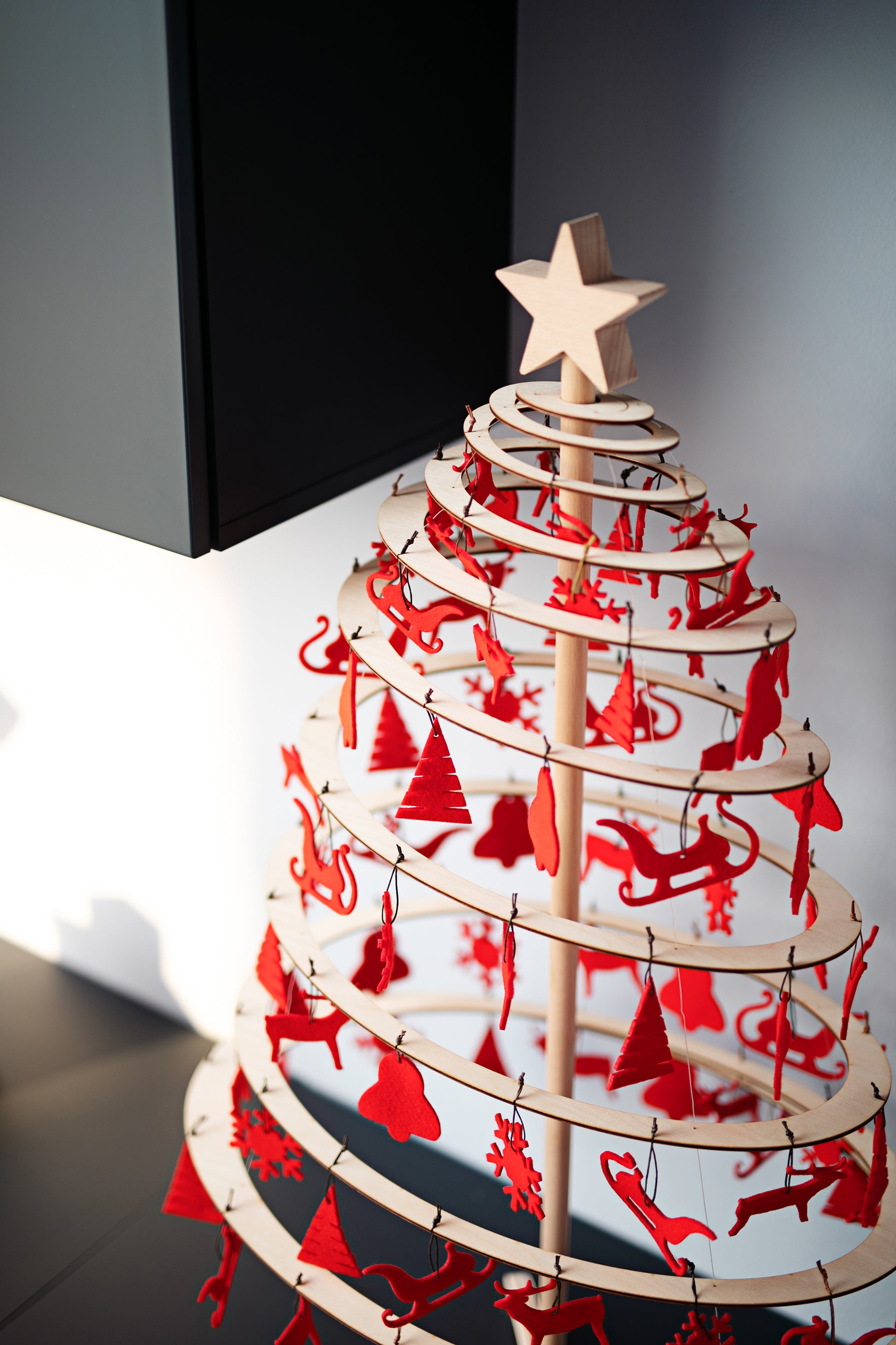 The Christmas tree in front of you is made of laser-cut plywood and a wooden stand. It can be quickly assembled and disassembled. It also allows easy storage in a 4 cm high box.