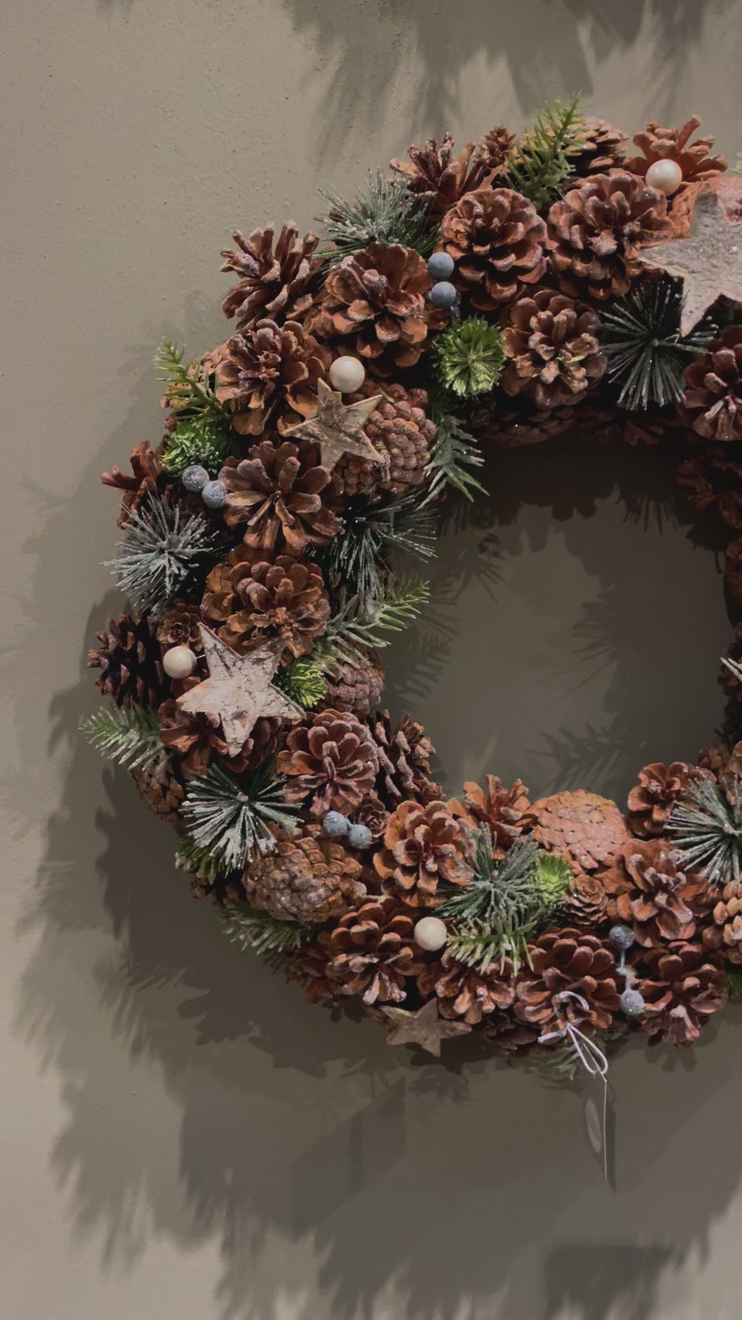 Elevate your holiday décor with our beautiful wreath adorned with pinecones, stars, and charming brown details. This exquisite wreath brings the rustic beauty of nature into your home, creating a warm and inviting atmosphere perfect for the festive season.
